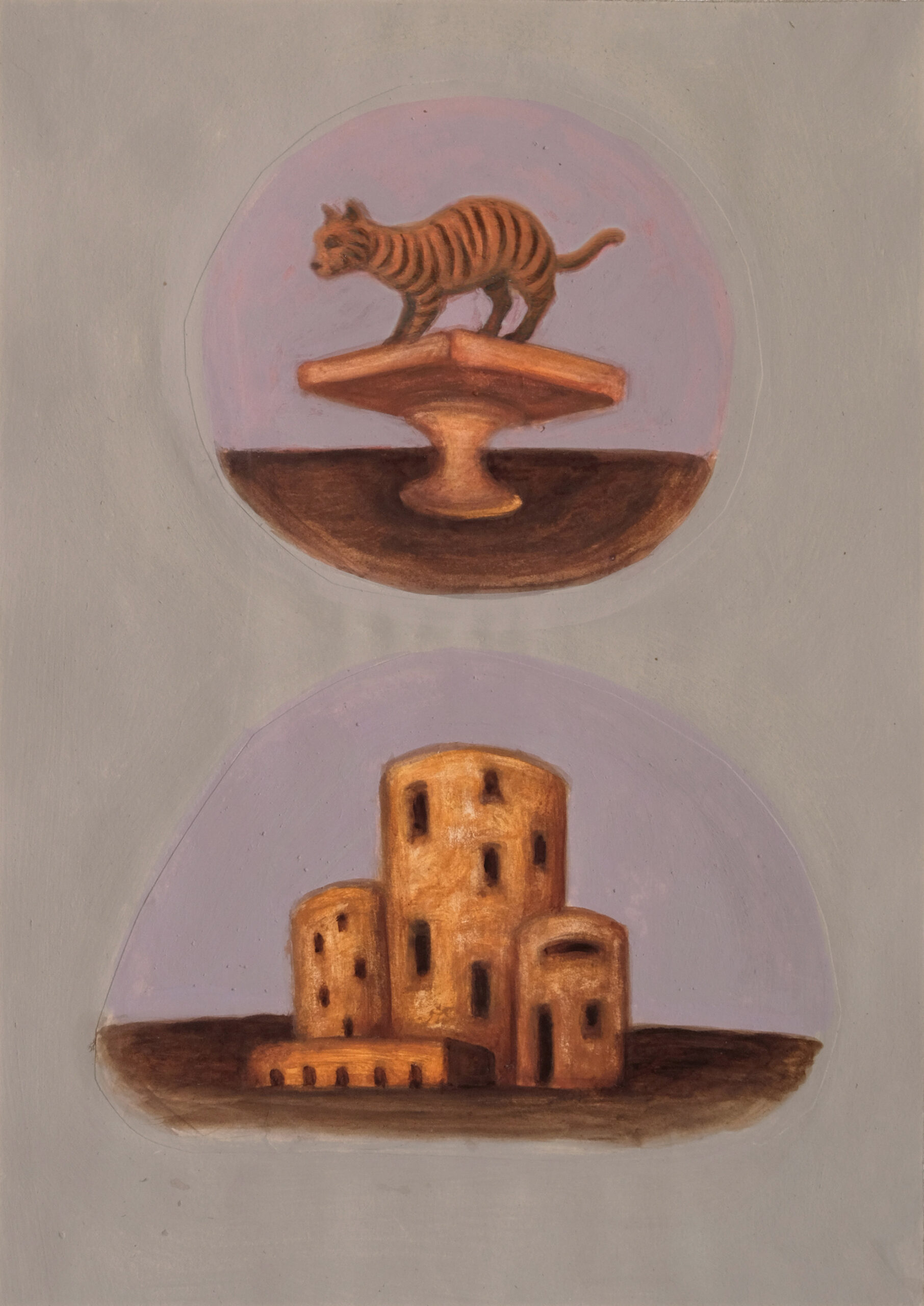 Associazioni semicasuali attraverso carta da scena incollata su cartoncino. Che l’inconscio di chi guarda lavori liberamente.