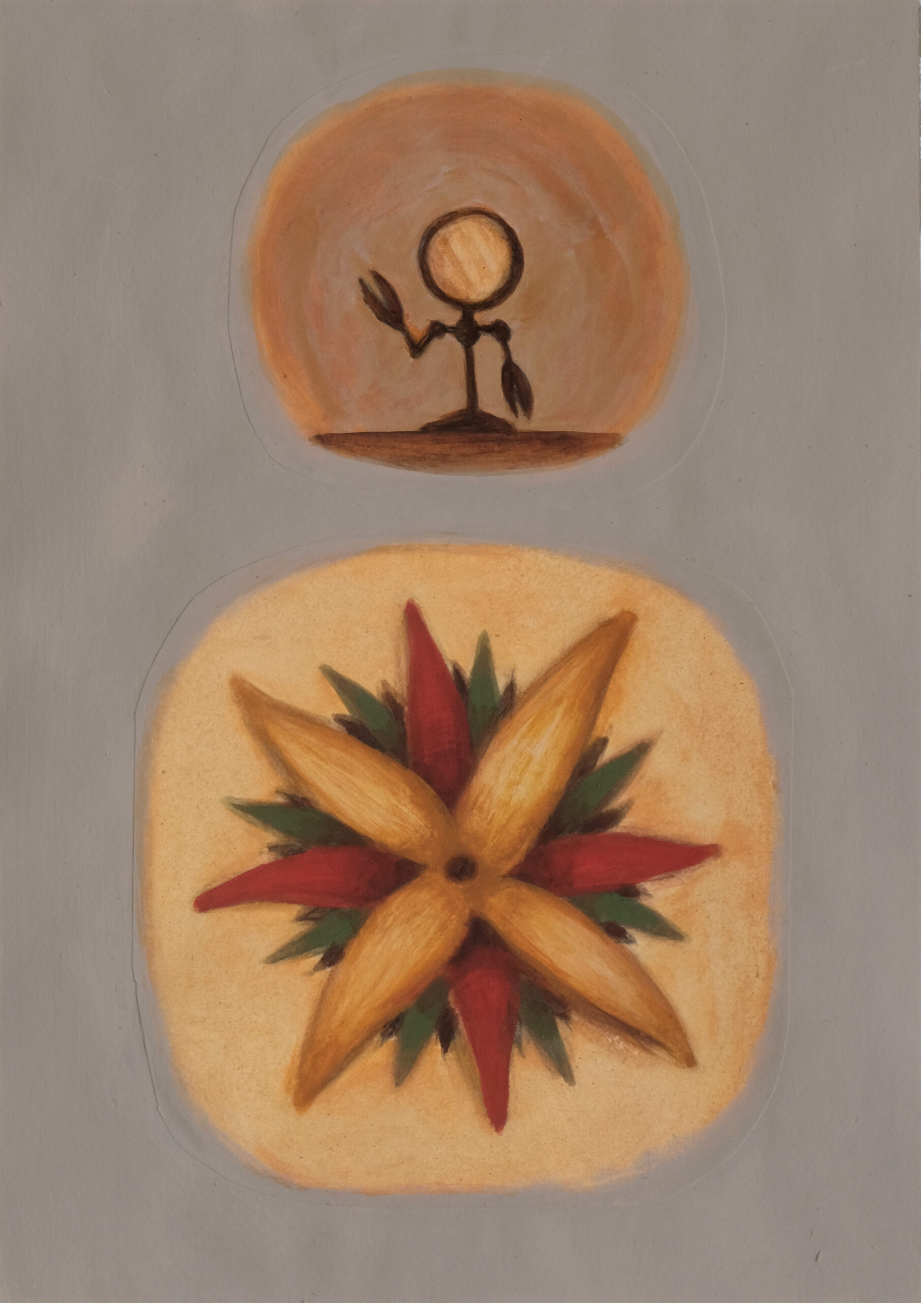 Tre elementi silenti o forse dialoganti su sfondo color fango luminoso. Pastello ad acqua, carboncino e pittura murale su carta da scena e cartoncino.
