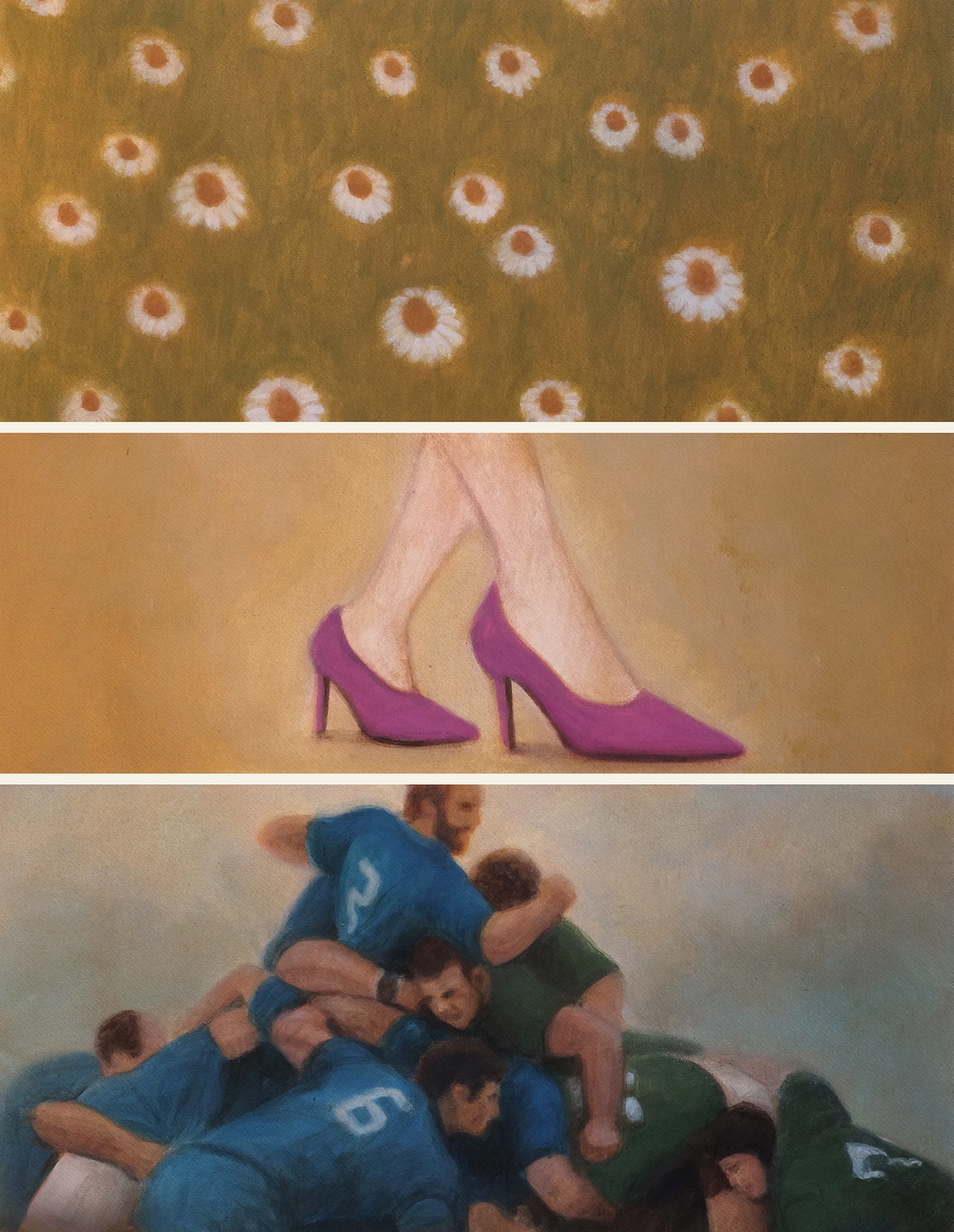 • Tensione fra delicatezza e forza — le margherite evocano fragilità/purezza; i tacchi sono eleganza che impone; la mischia è potenza fisica e resistenza. L’accostamento mette in scena fragilità e aggressività come facce della stessa energia.